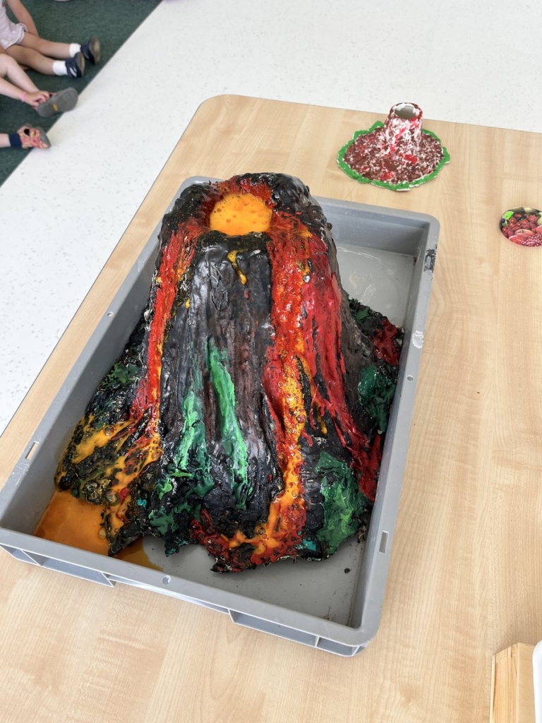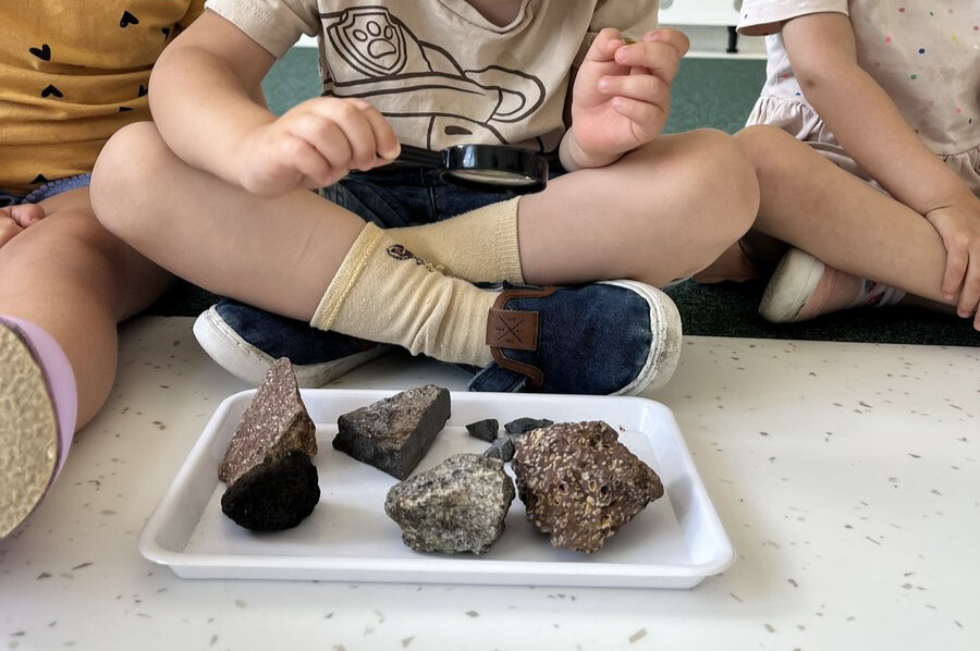 Nasze przedszkolaki podczas warsztatów fizyczno-chemicznych z ciekawością odkrywały, jak działa wulkan. Każdy miał okazję wziąć udział w eksperymencie obrazującym jego wybuch i wypływającą lawę, a także przyjrzeć się skałom różnego pochodzenia.