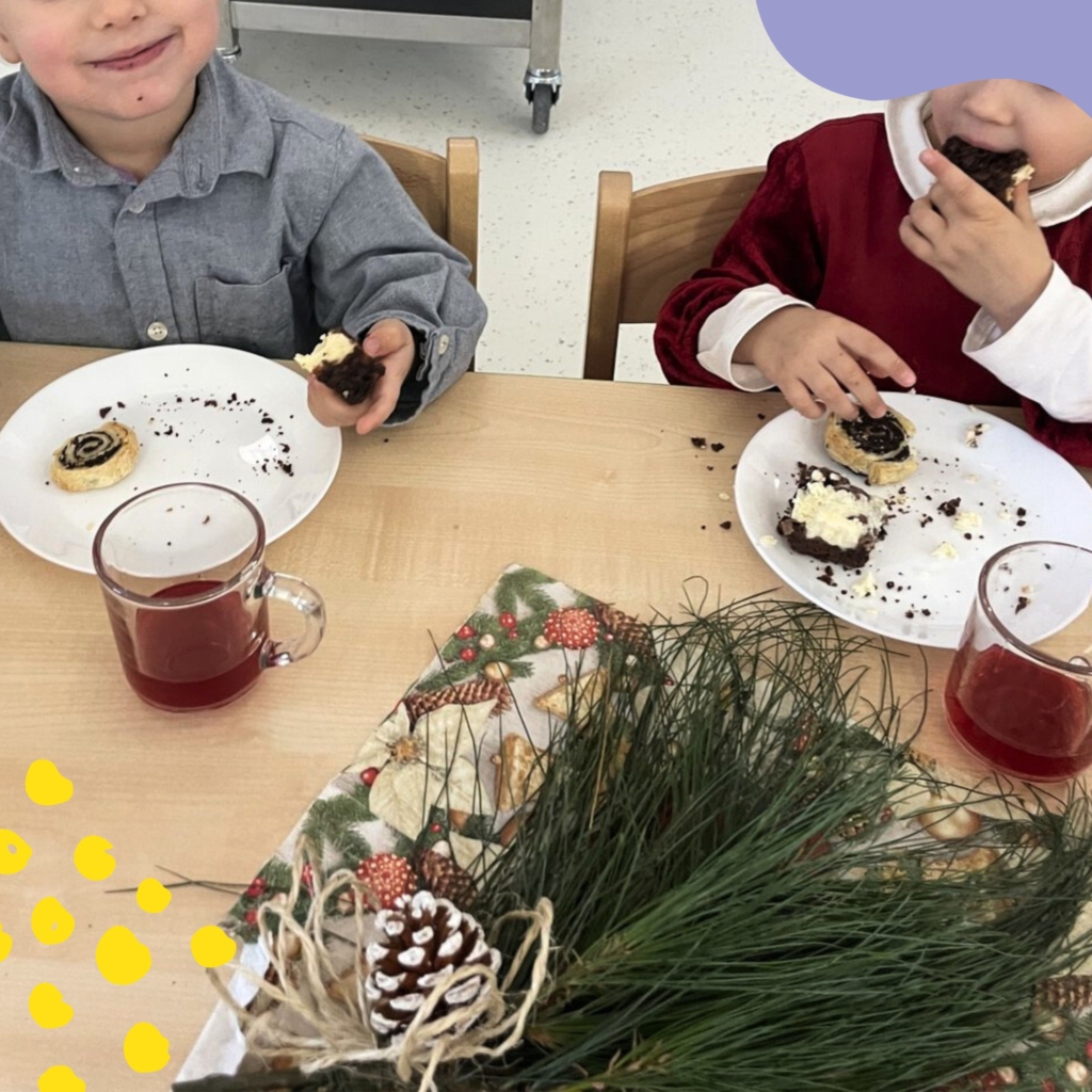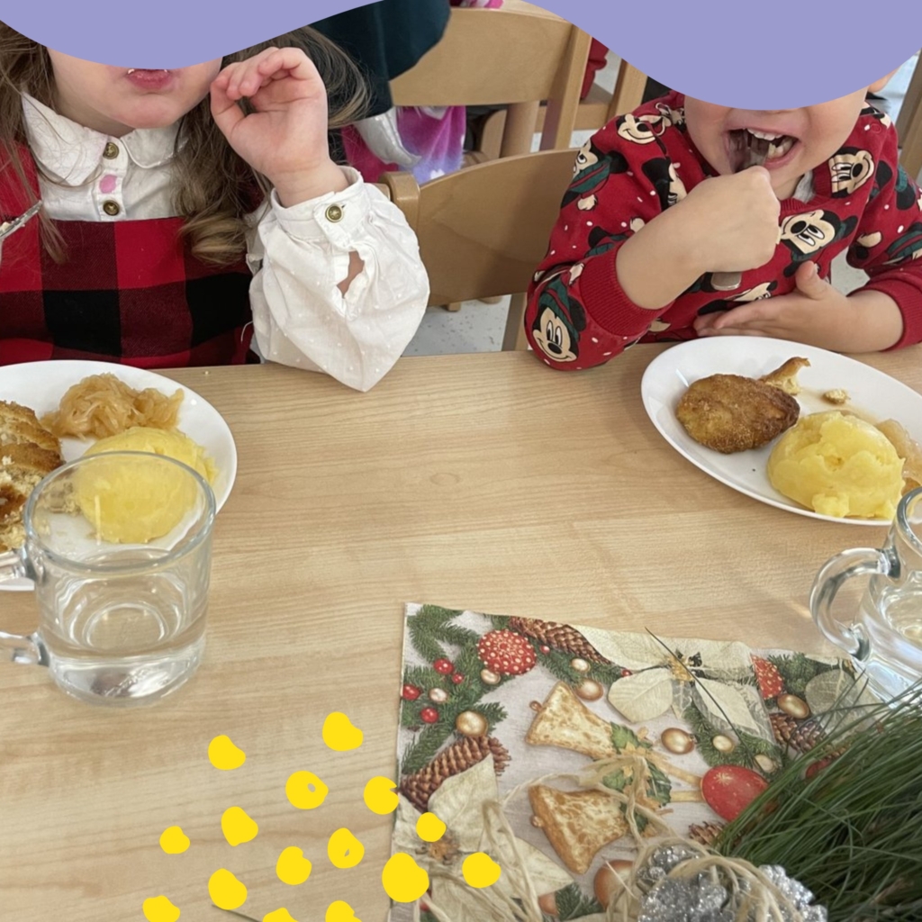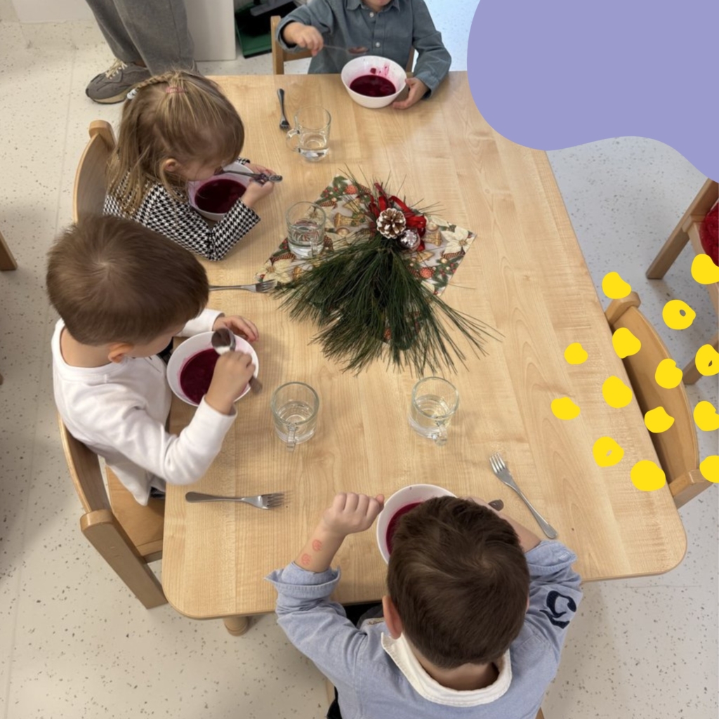 Dzieci miały okazję spróbować tradycyjnych świątecznych potraw – pysznego barszczu czerwonego, ryby z kapustą i ziemniaczkami. Na deser oczywiście nie mogło zabraknąć makowca i serniczka. 🍲🐟🍰